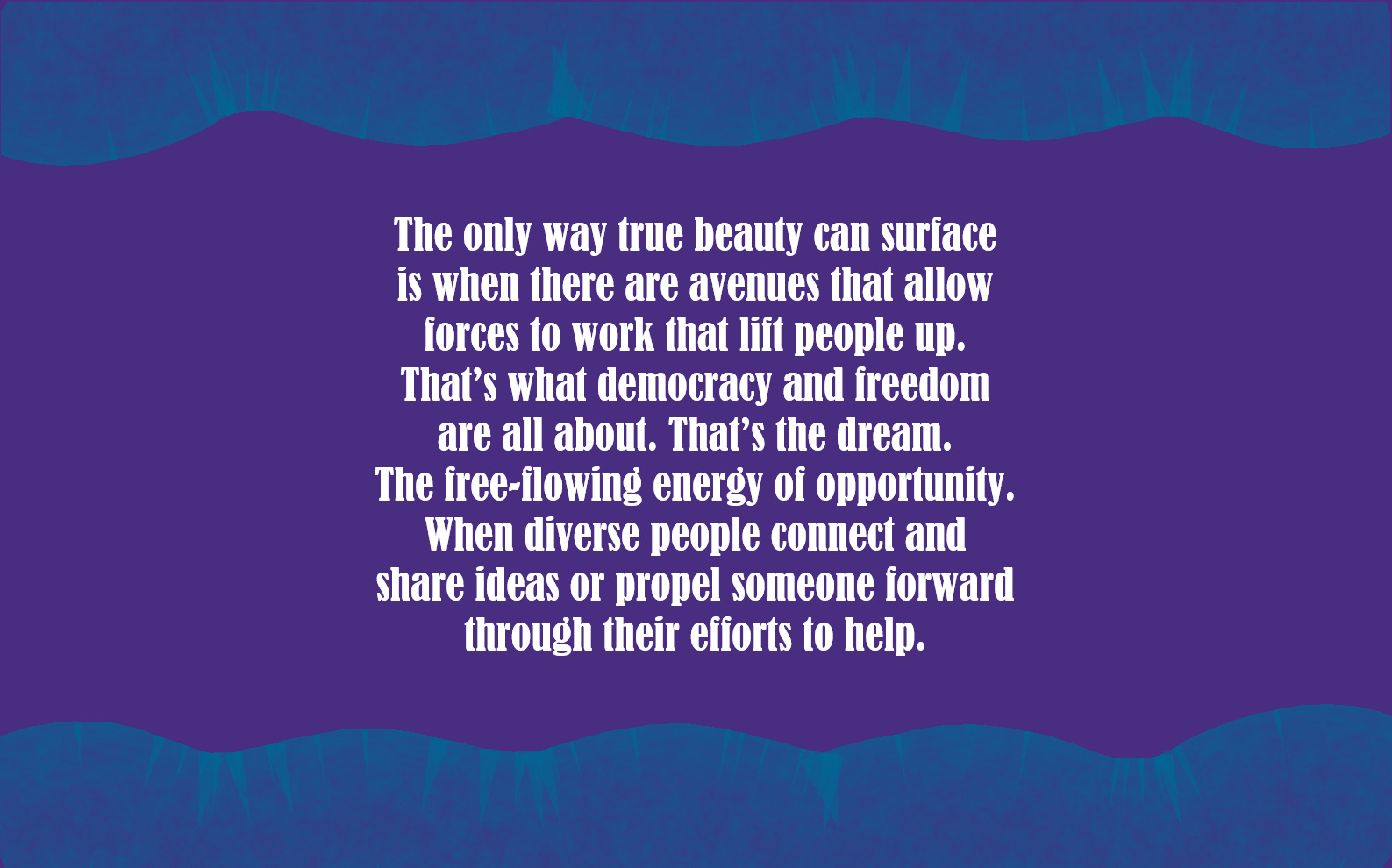 The only way true beauty can surface is when there are avenues that allow forces to work that lift people up. That’s what democracy and freedom are all about. That’s the dream. The free-flowing energy of opportunity. When diverse people connect and share ideas or propel someone forward through their efforts to help.