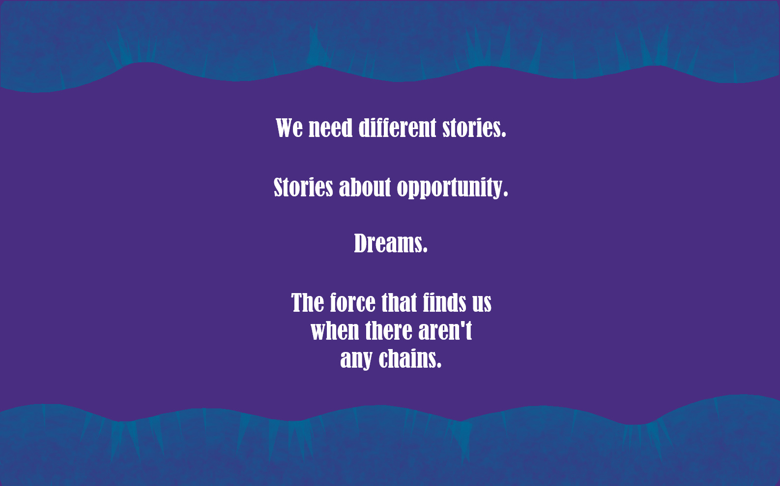 We need stories that will reach that family, those children, that business owner. Stories that say everyone deserves to be treated with dignity. That every society needs to allow opportunity, the good forces of the world that will find them. To allow everyone to see that profound beauty can happen to everyone when that force isn’t facing people who are in chains, where it is nearly impossible for it to operate.